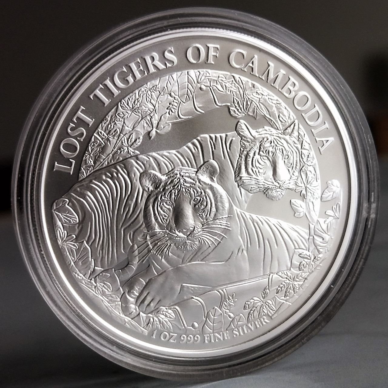 Срібні монети "Загублені тигри" вагою 1 унція з Камбоджі ретельно упаковані в індивідуальні капсули для збереження їх у ідеальному стані.